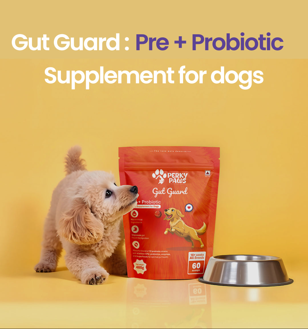 Gut Guard is packed with 12 clinically researched probiotic strains providing 4 billion CFUs per scoop, along with natural prebiotics from chicory root and FOS, digestive enzymes, and gut-friendly superfoods like pumpkin and papaya to support digestion and overall wellness. All ingredients are human-grade, non-GMO, and carefully selected to keep your dog’s gut healthy and happy. 🐾